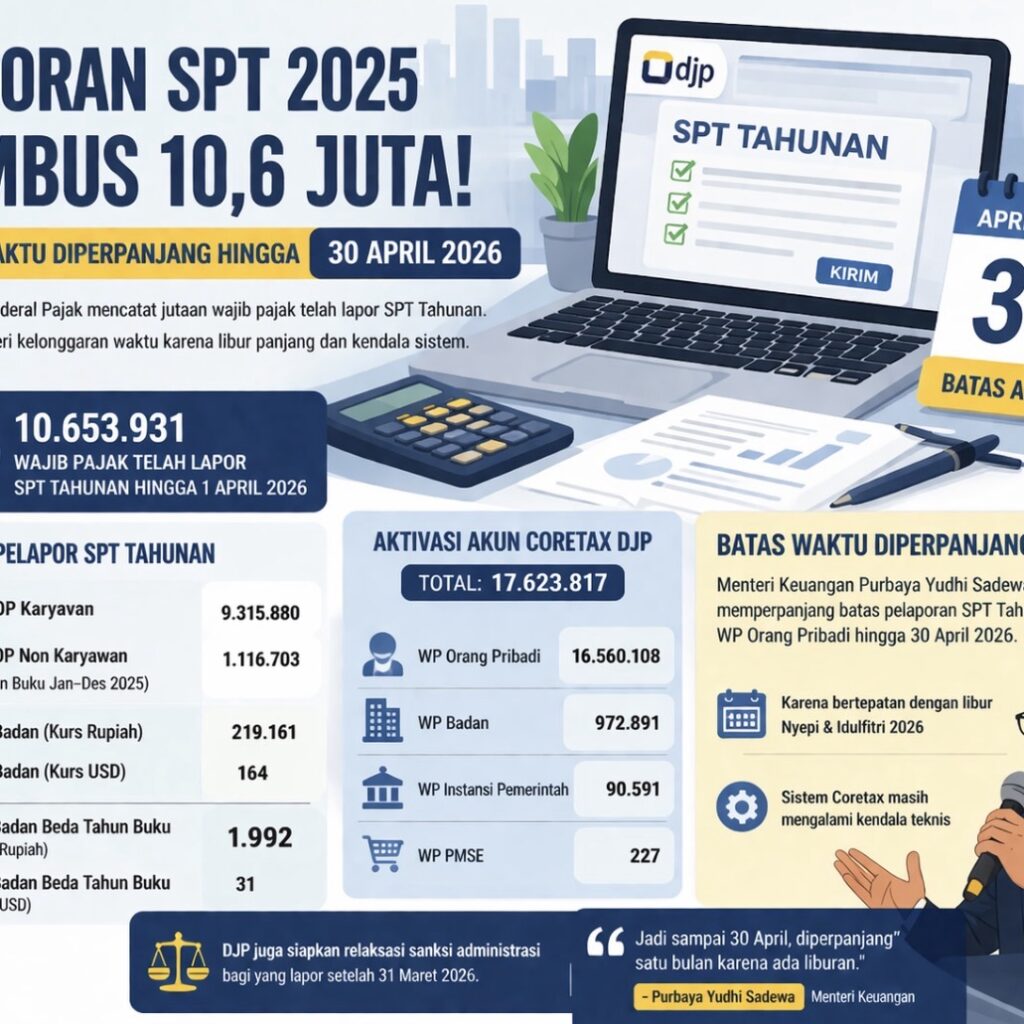 Pemerintah sebelumnya menetapkan batas akhir pelaporan SPT Tahunan WP orang pribadi pada 31 Maret 2026. Namun, Menteri Keuangan, Purbaya Yudhi Sadewa, memutuskan untuk memperpanjang batas waktu tersebut hingga 30 April 2026.